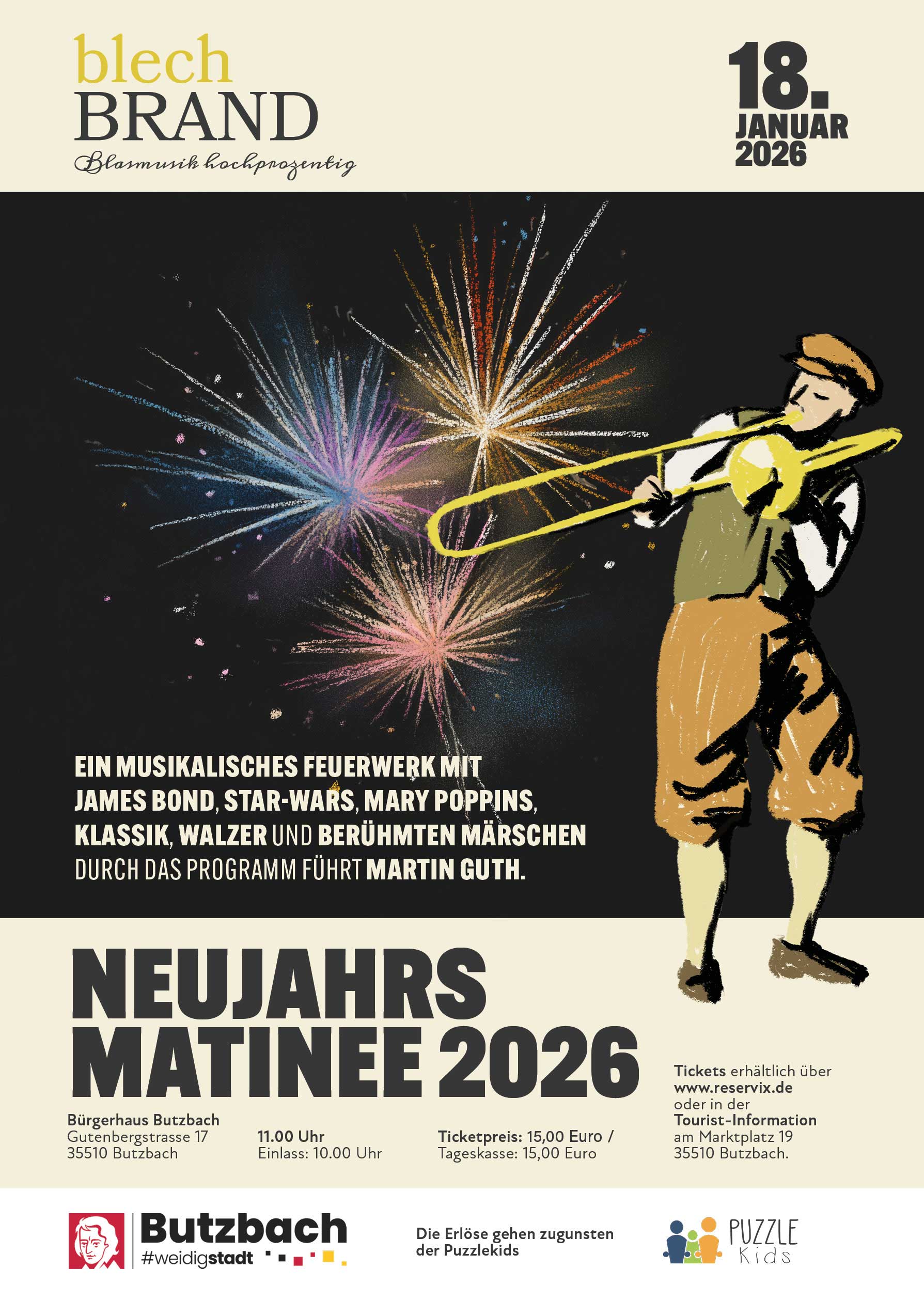 Am Sonntag, dem 18. Januar 2026, öffnet das Butzbacher Bürgerhaus seine Türen für einen ganz besonderen Vormittag. Die mittelhessische Formation „blechBRAND – Blasmusik hochprozentig“ gestaltet ab 11:00 Uhr die Neujahrsmatinee in Butzbach; der Einlass beginnt bereits um 10:30 Uhr – freie Platzwahl. Musik, die Herzen trifft und Gutes tut!
